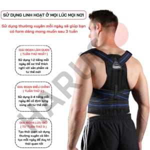 Khoác đai lên vai giống như khi mặc áo khoác. Phần đệm vai đặt gọn trên hai bên vai, các thanh nẹp chạy dọc theo cột sống và ôm sát lưng. Đảm bảo đai không bị lệch, trượt hay tạo cảm giác khó chịu.
